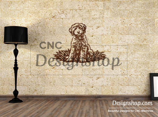 The Labradoodle Wall Art is intended to be cut from metal using a CNC cutting system. Once fabricated, this labradoodle artwork can be placed in a home or garden to show a love of dogs. This artwork depicts a fluffy Labradoodle sitting in a patch of grass.