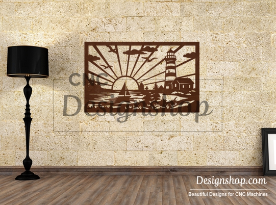 The Lighthouse Wall Art is intended to be cut from metal using a CNC cutting system. Once fabricated, this artwork can be hung on the wall to bring a serene coastal and nautical charm to any room or outdoor space. This artwork contains a lighthouse overlooking the ocean with a sailboat, birds, and a setting sun casting rays across the sky.