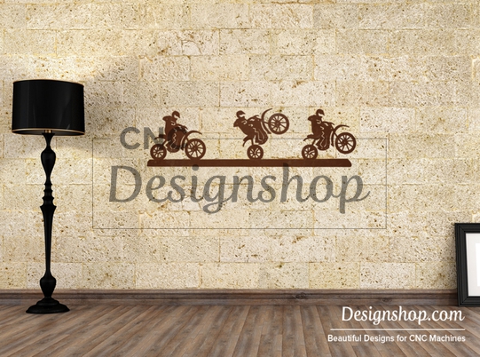 The Motocross Wall Art is intended to be cut from metal using a CNC cutting system. Once fabricated, this artwork can be mounted on a wall or displayed on a shelf to add a dynamic and adventurous touch to any space, especially for motorcycle enthusiasts. This artwork contains three motocross riders performing wheelies in a sequence that captures their motion and balance.